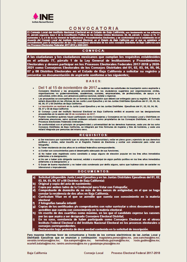 Invita INE BC a ciudadanos interesados en participar como consejeros distritales para el Proceso Electoral 2017-2018