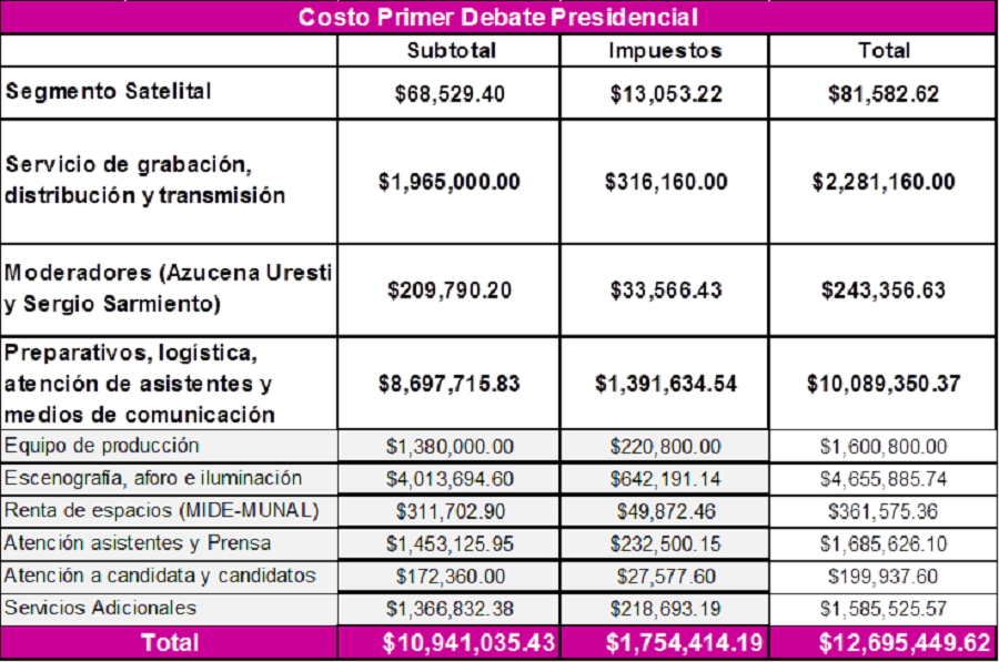 El costo del Primer Debate Presidencial fue de 12.7 mdp