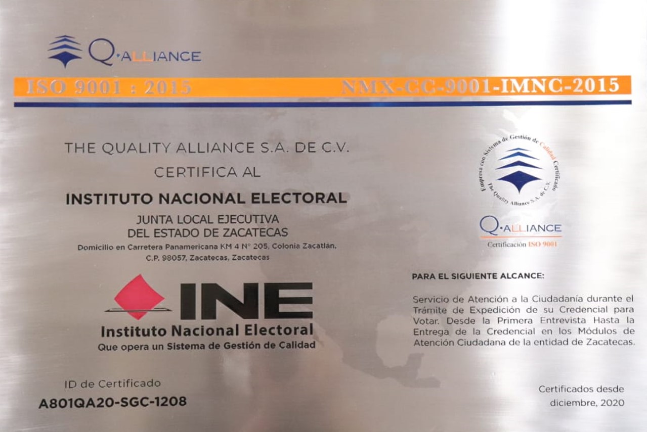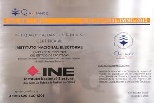 Recibe INE Zacatecas certificación de calidad en Módulos de Atención Ciudadana