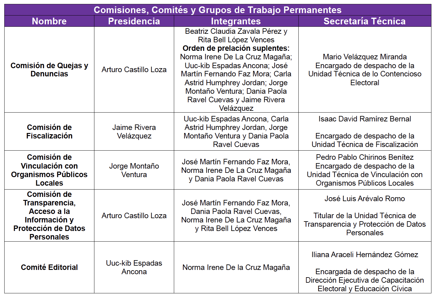 Tabla de presidencias Comisiones y Comités (2)