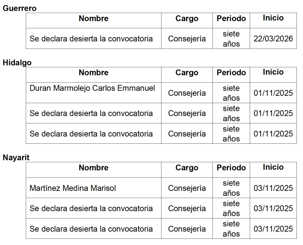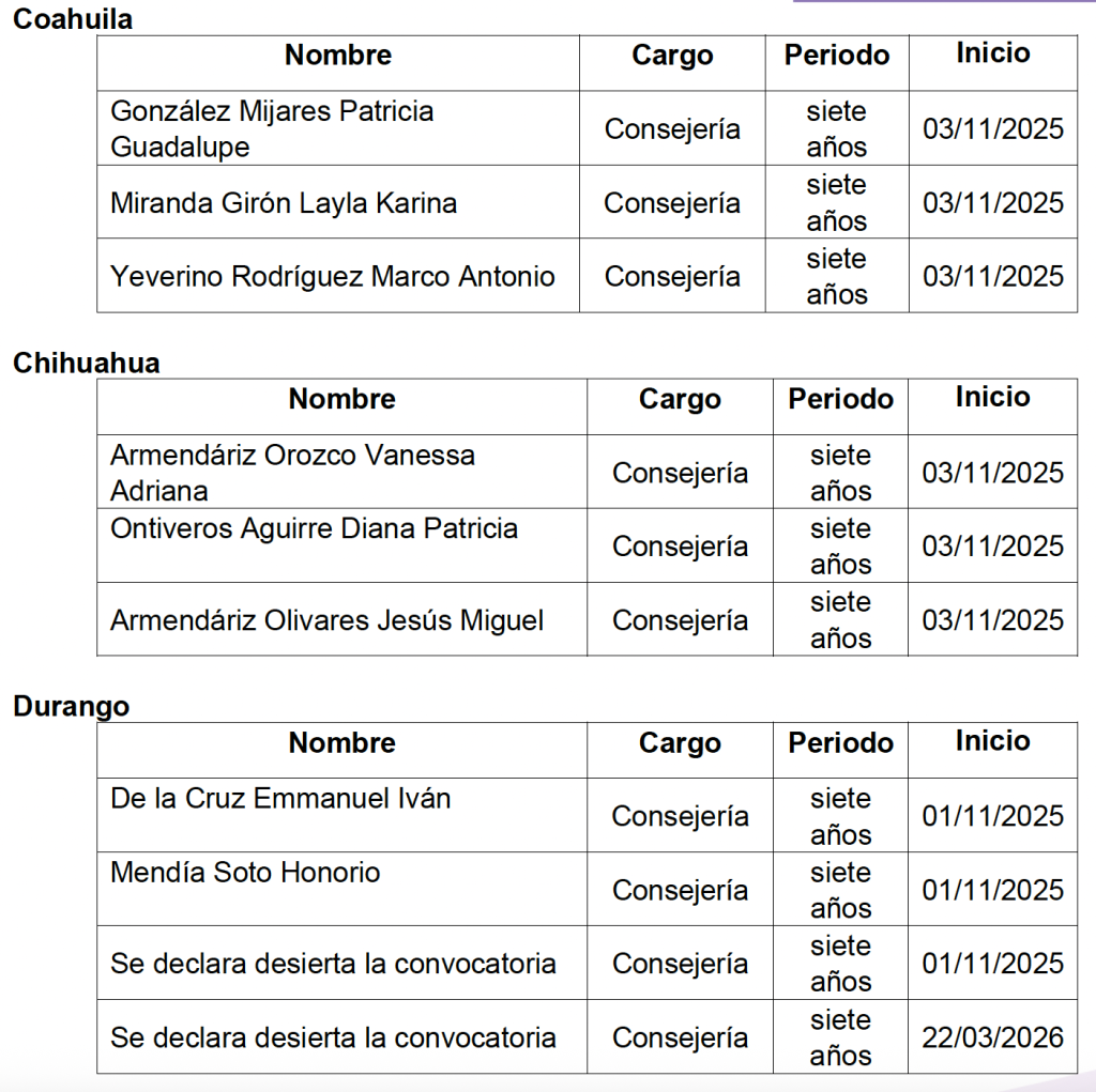 El Consejo General de Instituto Nacional Electoral (INE) aprobó la designación de la presidencia del Organismo Público Local Electoral (OPL) de Chiapas, así como las consejerías electorales en los OPL de Aguascalientes, Baja California, Chihuahua, Coahuila, Durango, Hidalgo, Nayarit, Puebla, Quintana Roo, Sinaloa, Tamaulipas, Tlaxcala y Veracruz.